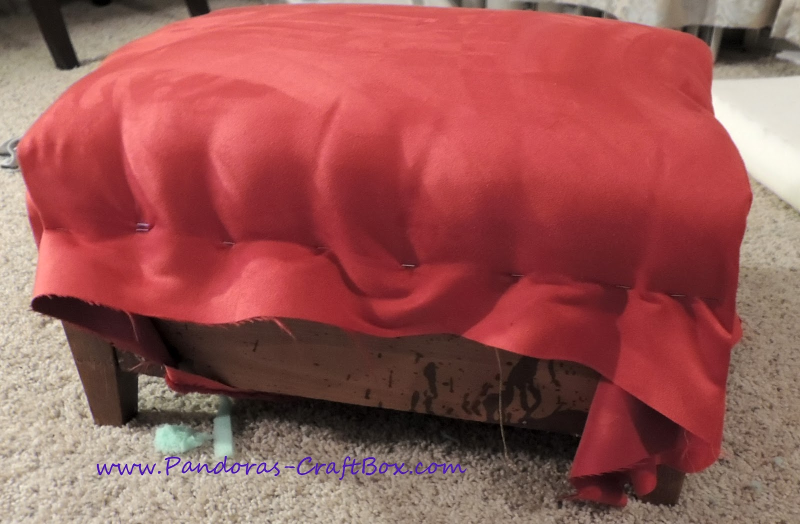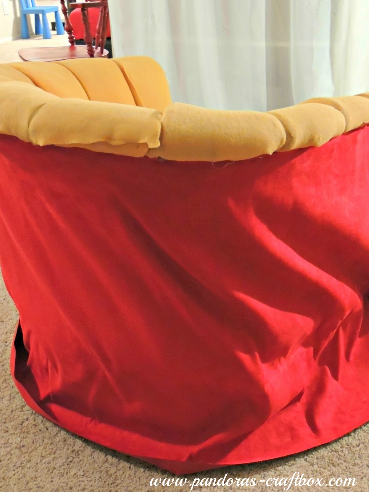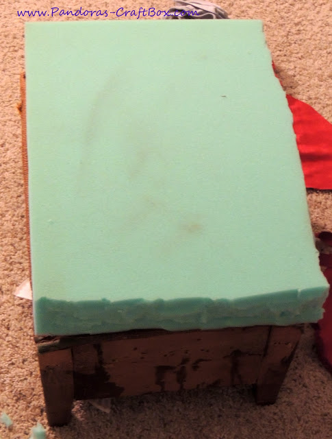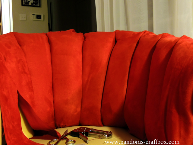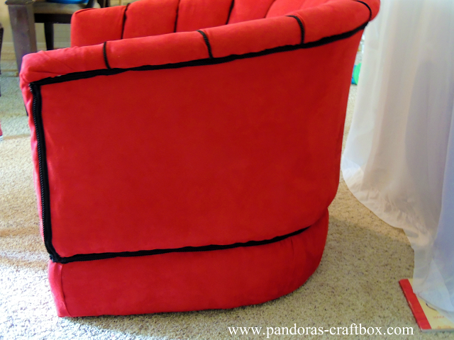 Do you love it? I decided to make this chair a sexy red velvet beauty. My hubby wanted a chair for himself since I use the other chair we reupholstered as my own and since his favorite color is red that's what helped decide on the fabric. I purchased the fabric from Joann's at 60% off during memorial weekend. Its home decor fabric which is more expensive but it's wider. I spent $54 on 4 and half yards of fabric, since I had gotten a gift card for my bday for $15, I only spend $39 out of pocket. Awesome deal right!?