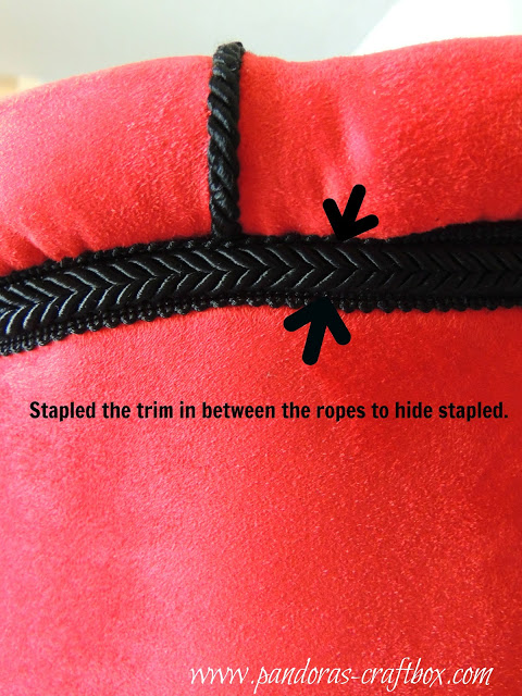 I also used a double rope trim to cover up were I stapled the single rope. I purchased the double rope to use every where else. It hides the staples very well and I did not have to use messy fabric glue.