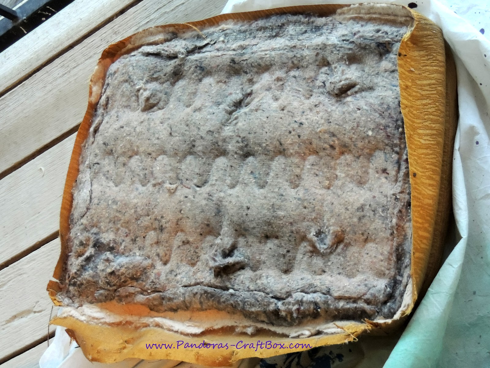 I use the original cushion fabric and I cut it up as a template. Then I started sewing it which took me about three hours to do. Yeah, I know, blah! I even recycled the zipper of the old cushion.