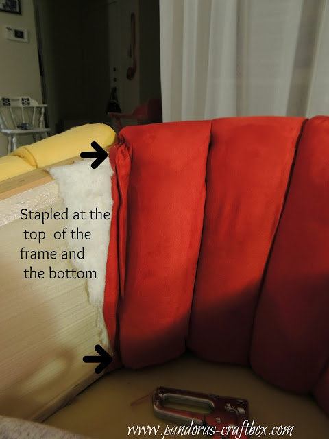When I began the center of the chair I used two long pieces of fabric and I stapled it in between each foam piece. I was only able to staple at the top of the chair and the bottom because there is no wood in at the center of chair where the foam which is where you would rest your back against.
