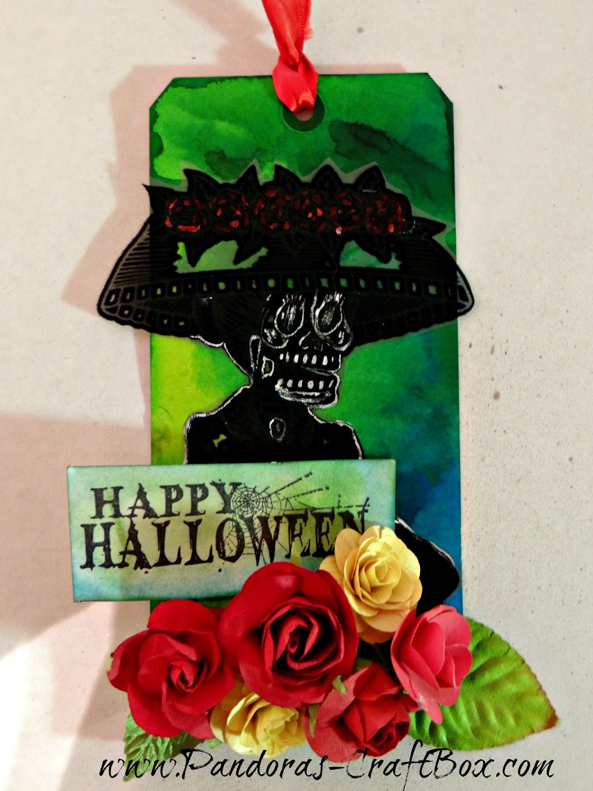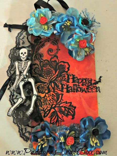 My Dies de Los Muerto Halloween tag came from an use iron on transfer that I used on a pillow. I did not want to throw it away because it was so cute. I decided to make it into a tag. The iron on transfer is from the cratfy chica found at Michaels.