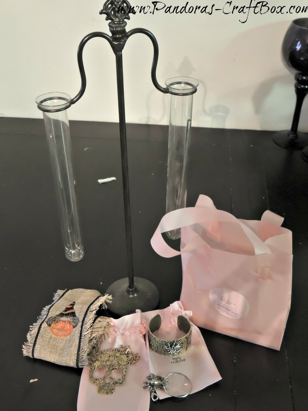 I purchased a test tube holder, Halloween inspired jewelry,ribbon and a monocle.